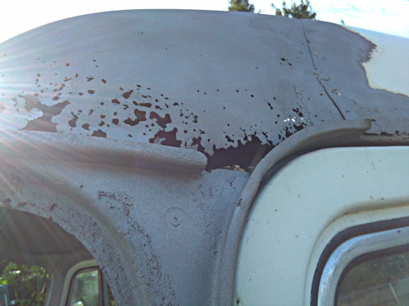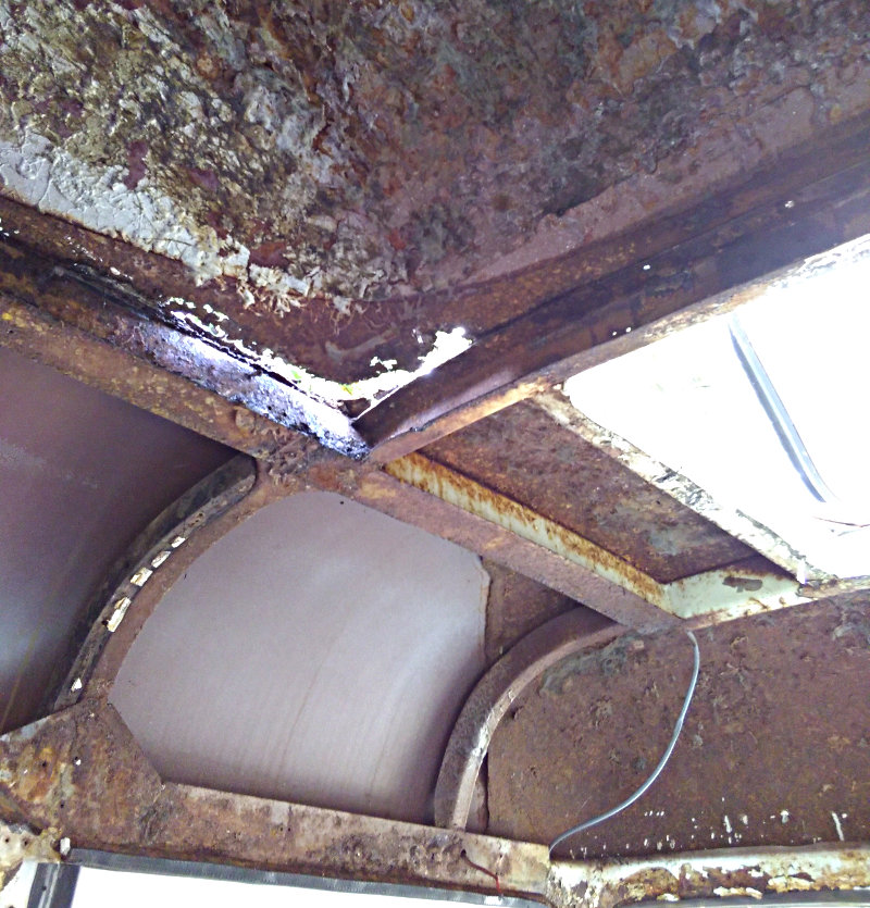 Schon beim Entkernen zeigten sich große, einfach zugespachtelte Löcher, die natürlich nur sehr kurze Zeit wasserdicht gewesen waren und der braunen Pest ordentlich Nahrung lieferten. Der ganze Bus stank furchtbar muffig, nachdem alles freigelegt war.