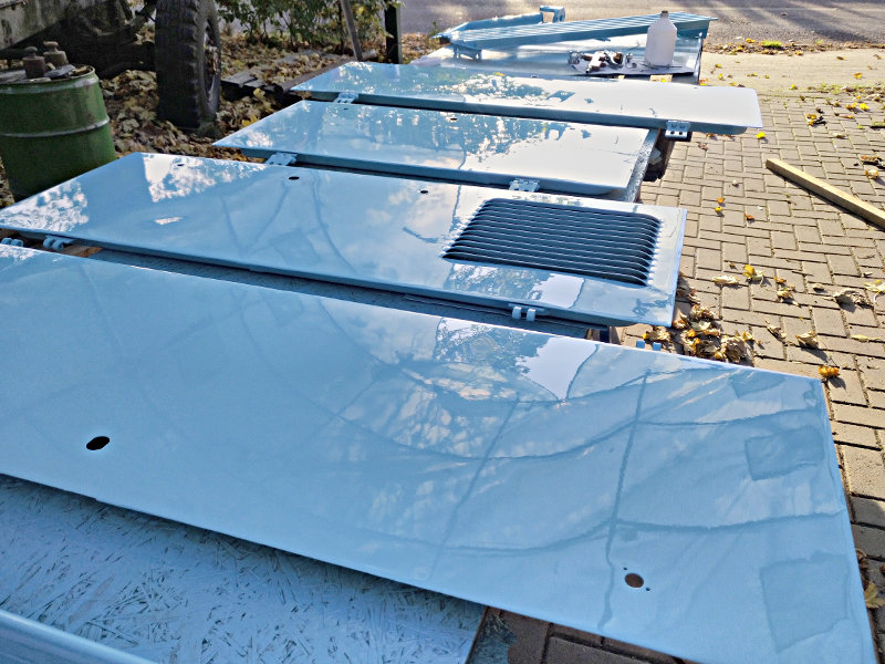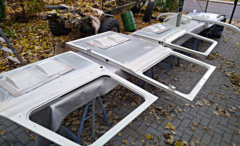Für die ganzen Anbauteile brauchte ich Platz im Zelt. Daher kam der Bus erstmal nach Hause und Türen, Klappen, Kleinteile, Grill usw. waren dran. Das fraß unglaublich viel Zeit. Ich glaube fast mehr als das Fahrzeug selbst.