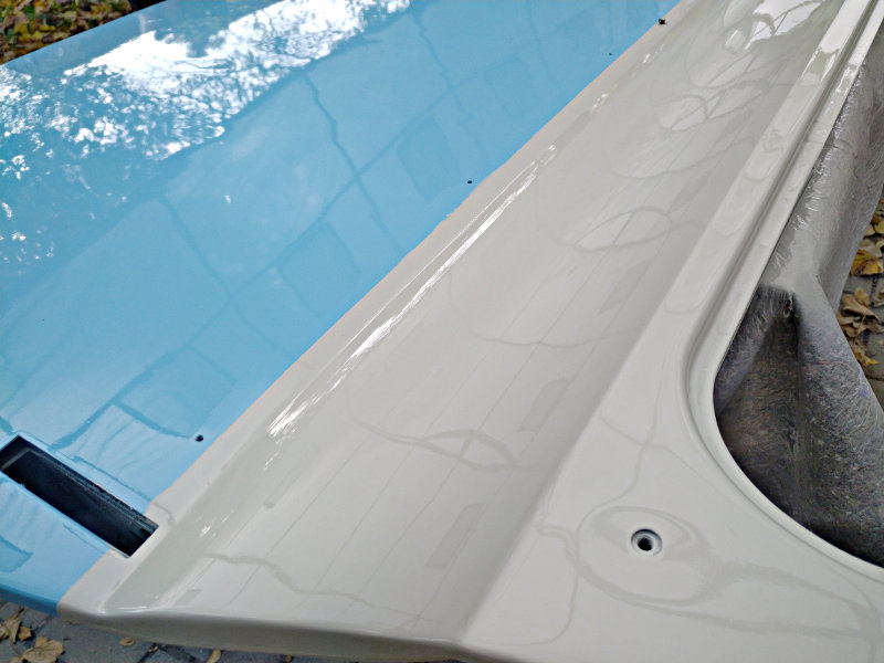 Eine meiner Hauptsorgen beim Lackieren im Freien war das Insektenproblem. Aus irgendeinem Grund wirkt frischer Lack wie ein Magnet auf das Getier und dementsprechend viele Fossilien finden sich anschließend in der Oberfläche. Ich weiß nicht, ob es am allgemeinen Insektensterben liegt oder daran, daß die Oberfläche in unter einer Minute staubtrocken war. Letztendlich erwies es sich hier überhaupt nicht als Problem und die drei oder vier suizidalen Kerbtiere schritten an Stellen zur Tat, die später nicht zu sehen sein werden.