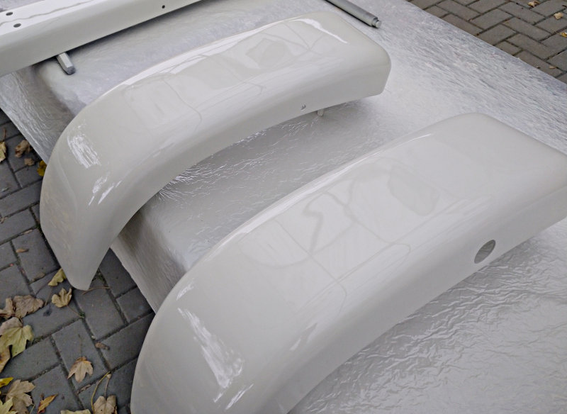 Nun wurde alles sauber abgeklebt, überstehender Farbnebel angeschliffen und das Dach sowie alle Holme und Fensterrahmen mit mehreren Lagen Atlasweiß versehen. Besonders beim Dach legte ich Wert auf eine möglichst große Schichtstärke, damit der Lack möglichst lange der UV-Belastung standhält.