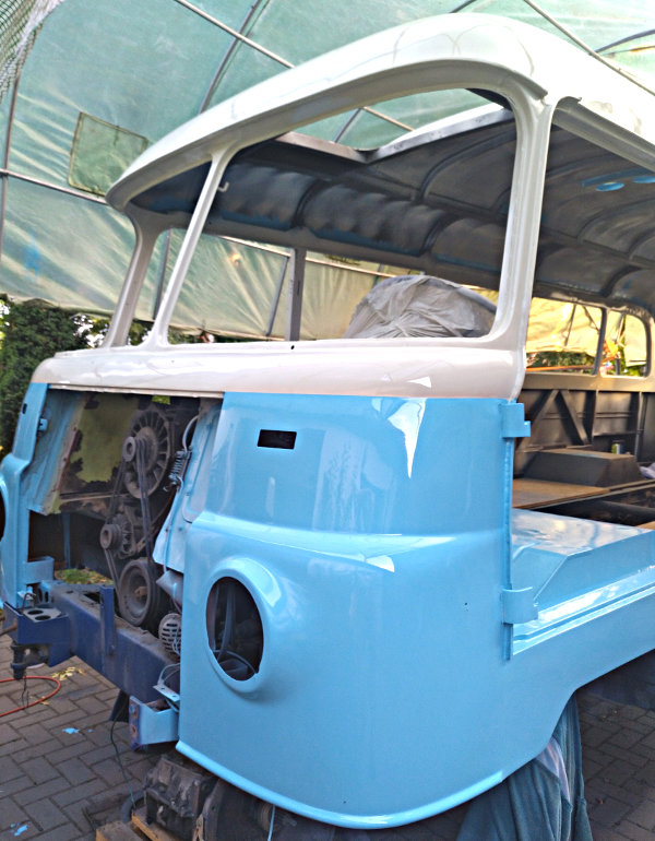 Zunächst mußte entschieden werden, welche Farbkombination gewählt würde. Aus praktischen Gründen (Hitze..) sollte das Dach wieder weiß werden. Unten herum war rot oder blau im Gespräch, wobei meine Holde und ich uns dann für letzteres entschieden. Um den genauen Farbton zu finden orderte ich bei Lackpoint.de jeweils eine Spraydose mit Olympia- und eine mit Kristallblau. Beides sind Farben, wie sie auch im Original verwendet wurden. Nach einem kurzen Sprühtest am Bus sagten wir beide einhellig, daß uns das Kristallblau am Besten gefällt.