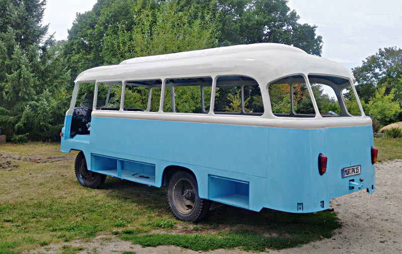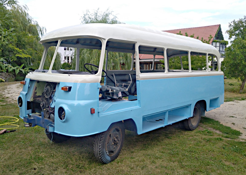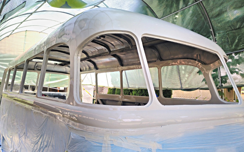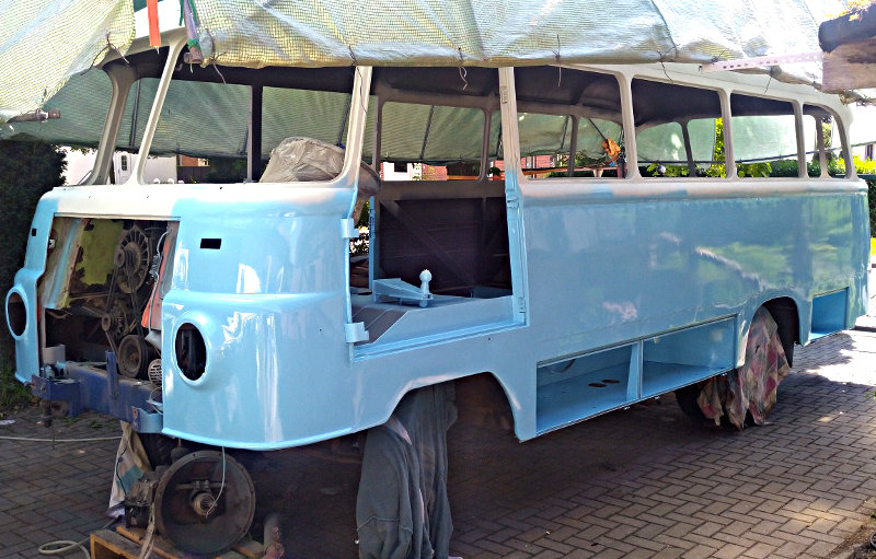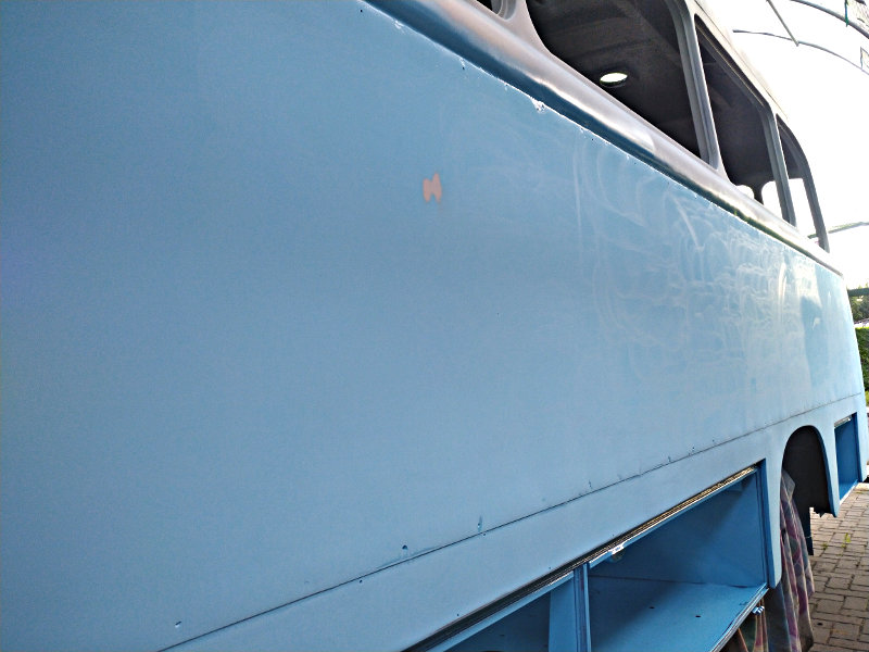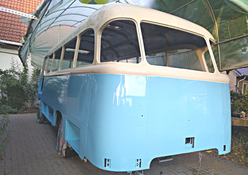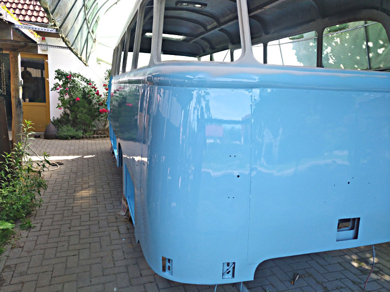 Als die Abklebung abgenommen werden konnte, war nun endlich ein optischer Einduck zu gewinnen, wie der Bus mal später wirken würde. Die moralische Wirkung einer fertigen Lackschicht ist enorm. Nachdem monatelang nur ein scheinbares Wrack zu sehen war, stand nun plötzlich ein glänzender Bus in der Einfahrt! Viele Passanten, die den Fortschritt die ganze Zeit eher kritisch beäugt hatten, gratulierten mir plötzlich. Aber auch so bekam meine Moral nochmal einen richtigen Schub.