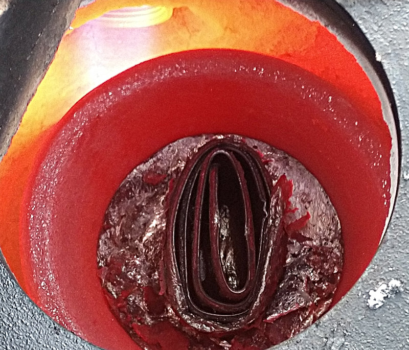 Vor ein paar Jahren habe ich mal eine Gasesse gebaut, die sich auch hochkant gestellt als Schmelzofen eignet. Dort hinein stellte ich einen Graphittiegel und füllte ihn langsam mit aufgerollten alten KFZ-Kennzeichen. Für dieses Material entschied ich mich, weil es sehr korrosionsbeständig ist. Schaut Euch mal die Rückseite eines Kennzeichens an: Selbst nach Jahrzehnten voll Dreck und Streusalz ist es noch blank!