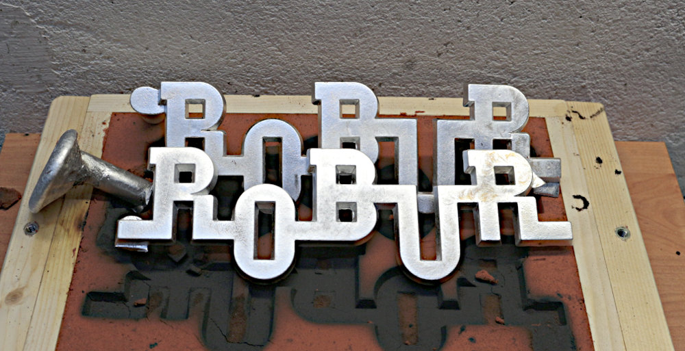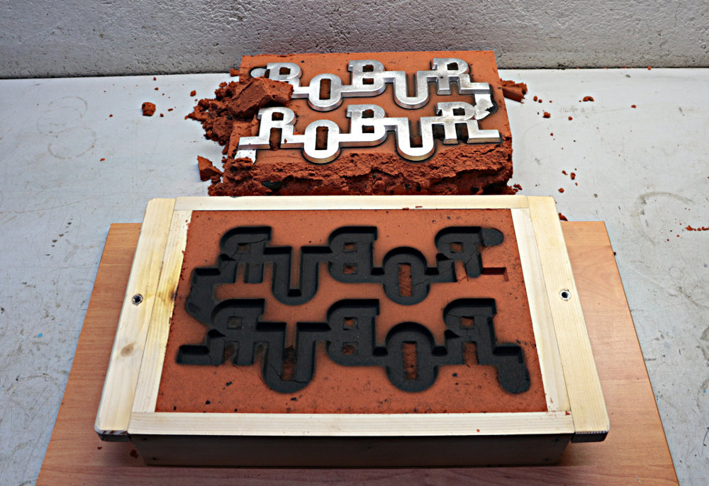 Trotz aller Sorgfalt ging der erste Guss schief, da ich den Steiger an einer ungünstigen Stelle gesetzt hatte. So konnte die Luft aus dem letzten Ende des Schriftzuges nicht entweichen und aus ROBUR wurde entsprechend POBUR.